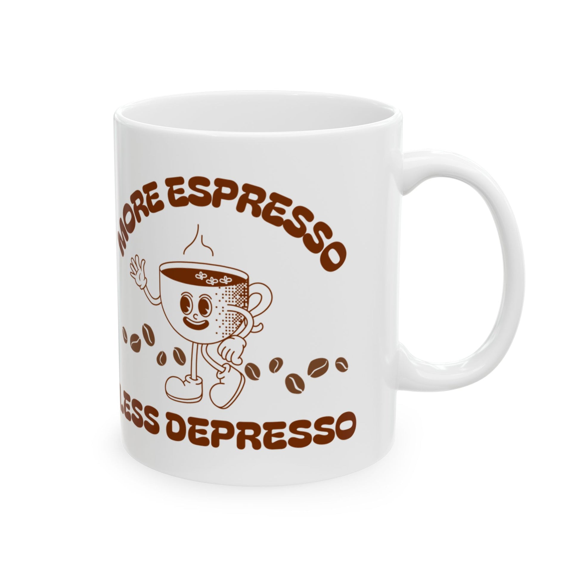 This glossy ceramic mug brings a quiet, joyful moment to every coffee break. Warm brown tones and a playful espresso character wrap the cup, reminding the drinker to savor ritual and slow mornings. It feels at home on a cluttered desk, by a sunny kitchen window, or held between cold hands outside a tiny café. Lightweight but sturdy, the mug’s smooth C-handle and shiny finish make each sip simple and satisfying. For those who live by slow sips and good beans, this mug turns ordinary routines into gentle celebrations.